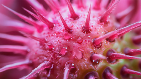 A striking close-up of a virus with pink spikes showcases its complexity and scientific importance during health research.