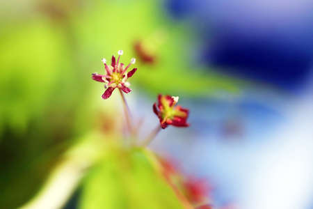 Japanese maple with green new leaves and tiny red flowers, close-up photo
