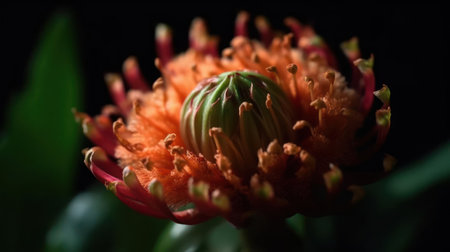 A vibrant flower showcases its intricate, colorful structure with numerous delicate petals and stamen. Soft, diffused light highlights the beauty of nature in a serene environment.