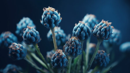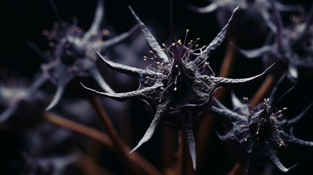 a close-up portrait photograph showcasing the intricate details of unknown helicobacter pylori biological virus alien flowers. the image captures the brittle yet beautiful and dry elegance of the flowers, with rich and vivid contrast. shot on a 100mm lens at f/2.0, the natural lighting enhances the realistic and impressive qualities of the photo. the black tones and crispness add depth of field, resulting in an