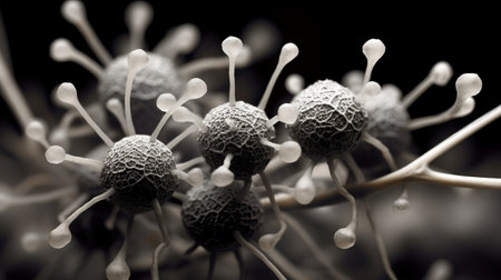 a close-up portrait photograph showcasing the intricate details of unknown chlamydia trachomatis biological virus alien flowers. the image captures the brittle yet beautiful and elegant nature of these flowers, with vivid contrast and depth of field. shot on a 100mm lens at f/2.0, the photo exhibits rich black tones and crisp details. the natural lighting adds a realistic and impressive touch to this 8k uhd