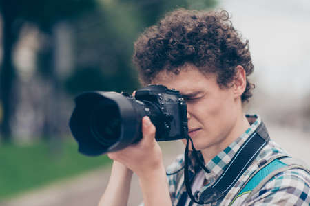 Portrait of young man, photographer, cameraman with professional camera, equipment during working summer day outdoors. Concept of occupation, job, education