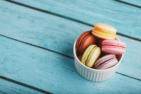 Sweet colorful macarons. Traditional french macaroons. Tasty dessert in bowl. Top view.