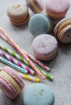 Beautiful colorful tasty macaroons on a gray concrete background
