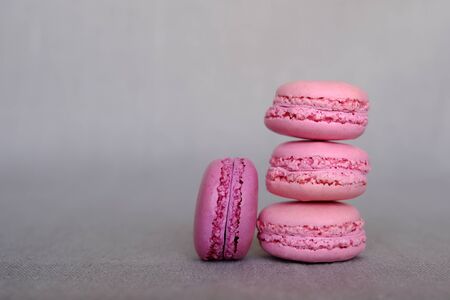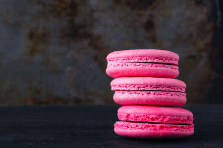 Stack of delicious french pink strawberry and blackberry flavour macarons on grey background. Copy space. Sweet food, confectionery
