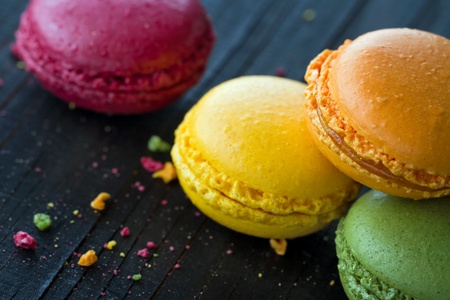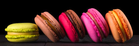 Closeup of colorful macaroons on black wooden background