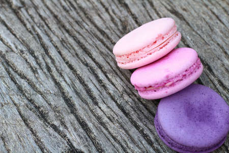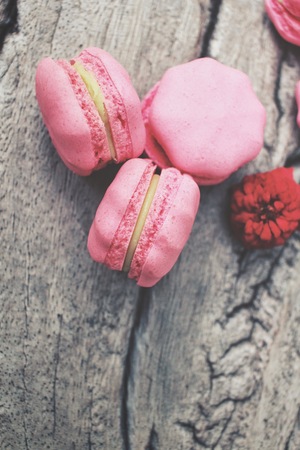 Pink french macaroons on rustic background