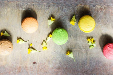 Colorful macaroons on a wooden background. Top view.