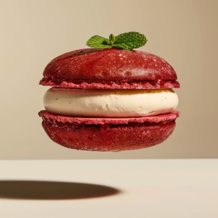 A stunning floating red macaron with a creamy filling, garnished with a fresh mint leaf, showcasing elegance and minimalism against a neutral background.