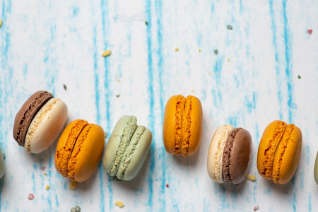 Image of a few macarons of various colors, stacked on a table and blue background, with copy space