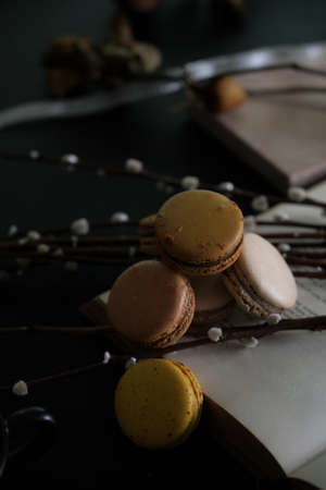 Cropped shot of French macarons on black table with book and pussy willow decorated