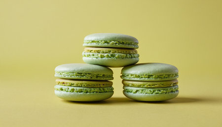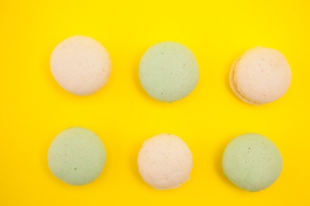 Tasty french macarons on a yellow pastel background.