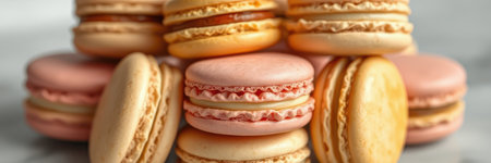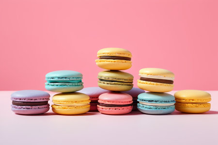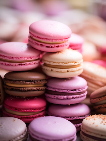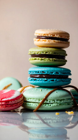 Colorful macarons stacked artistically on a marble surface with soft lighting