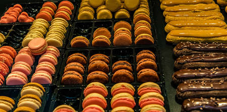 Many colorful makaroons and chocolate and caramel eclair with nuts and cream on display