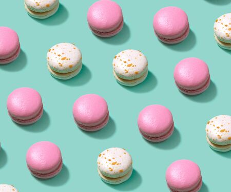 Colorful cake macaron or macaroon on turquoise pastel background from above. French almond cookies on dessert top view