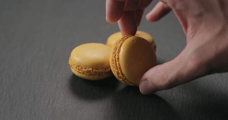 man hand put orange macarons on slate board, wide photo