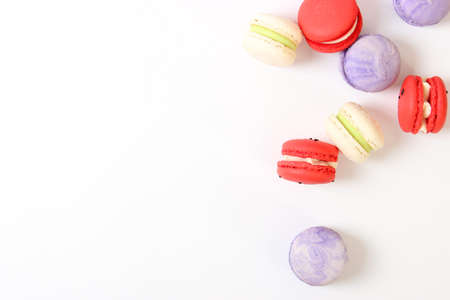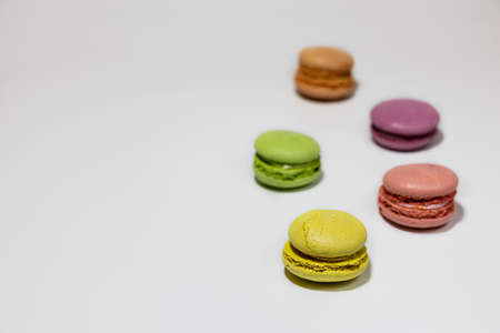 Colorful macaroon cookies on a white background in perspective. Dessert.