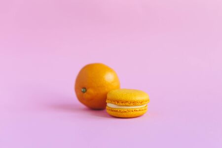 Tasty french macaron and tangerine on pink background. Close-up. Place for text.