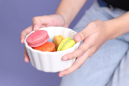 The Asian woman holding macaroon on the purple background.