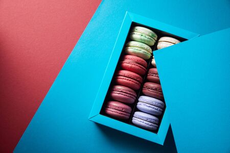 Pile of sweet colourful macaroons in blue gift box, French delicious dessert, Flat lay, top view.