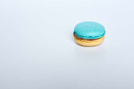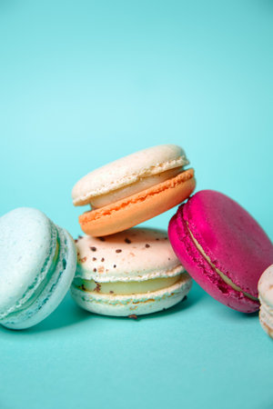Close up of delicious fresh macaroon on turquoise background with copy space for confectioner, cafe, bakery