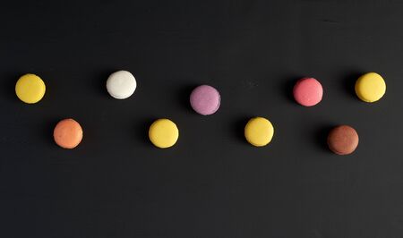 round multi-colored baked macarons with cream lie in a line on a black background, flat lay