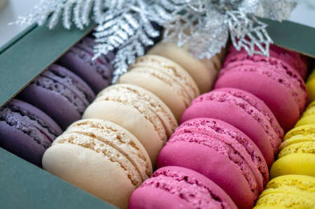 Colorful delicious macaroons in a row. Colorful macaroons cookies are in a gift box. Background, close-up, selective focus.