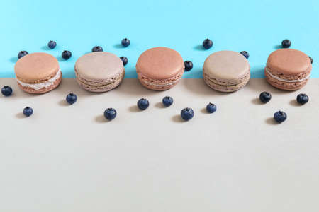 Colorful macaroons on blue background. Sweet macarons. generative ai