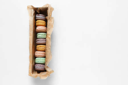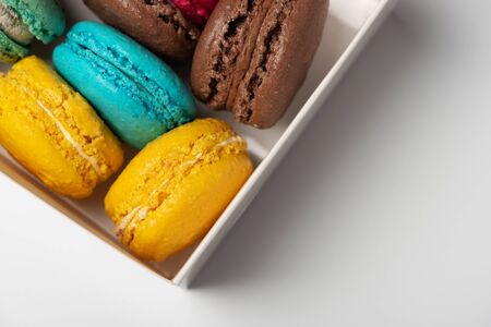 Close-up box with French macaroons on white background. Flat lay. Top view. Selective focus