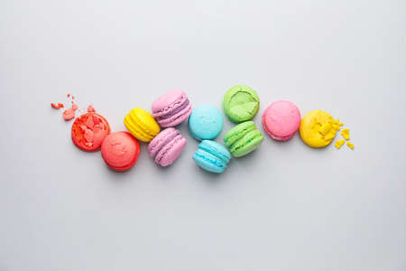 French sweet colorful fruit cookies macaroons with crumbs on light background. From above with copy space. Flat lay, pattern, textured