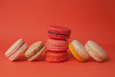 Pile of colorful macaroons stacked up like a tower and macarons on their two sides in red pastel isolated background
