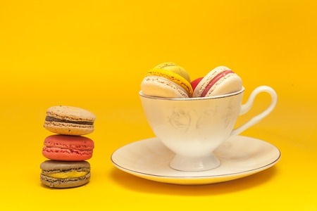 Pile of colorful macarons stacked up in the white classic cup in yellow pastel isolated background