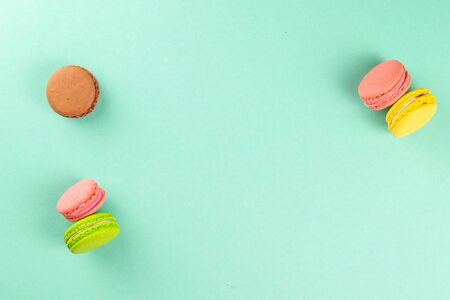 Colorful macaroons stand on a mint background. Top views with clear space