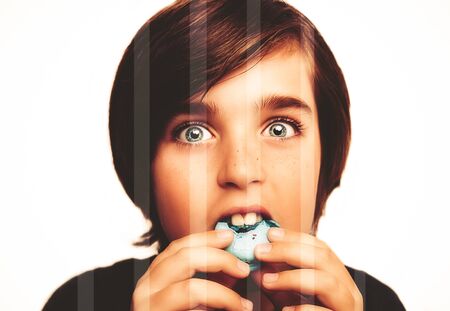 Handsome boy holds in his hands macaroni over white background