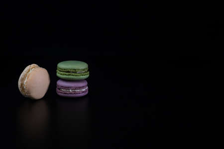Colorful tasty macarons isolated on black background, french macarons dessert