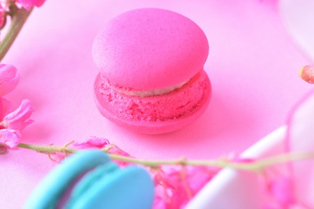 flat lay of colorful unstable french macaroon cookies like background, dessert concept of pastel pink color