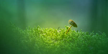 Tree fallen on the ground and covered with green moss and mushrooms blured background