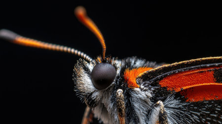 A close up of a butterfly's head with orange and black wings. The butterfly is resting on a black background