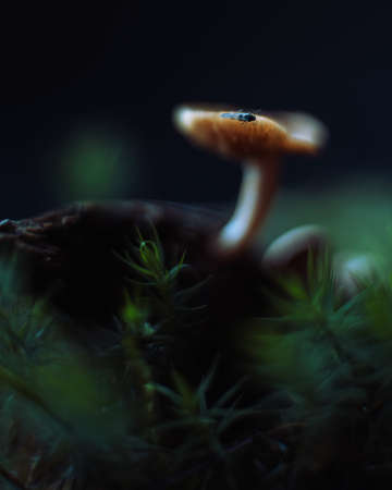 Mushroom with a small bug and moss on a piece of dead wood. Macro photo.
