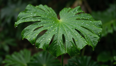 Macro view of rain soaked green monstera leaf on tropical backdrop