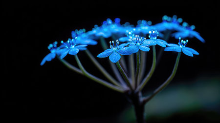 blue hydrangea flower on black background, macro photo with shallow depth of field