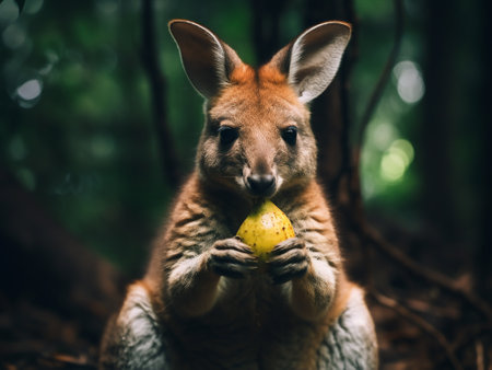 Kangaroo in the forest eating an apple. Animal portrait.