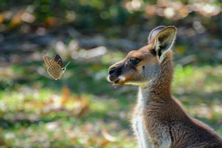 A kangaroo observes a butterfly in a grassy area, A kangaroo gazing curiously at a passing butterfly