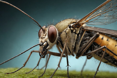 Detailed close-up of mosquito resting on a leaf, showing wings, legs, and body texture, with a calm natural green background.