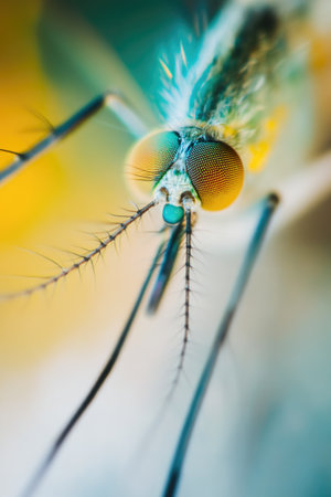 A mosquito is depicted with an extreme focus on its large, colorful eyes and delicate mouthparts.
