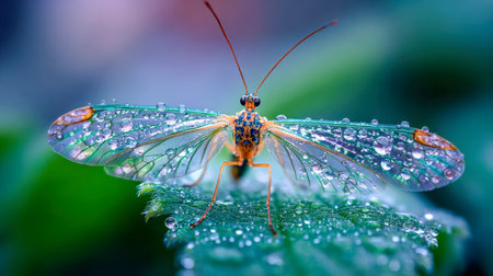 A tiny insect with shimmering transparent wings, adorned with glistening dew drops, rests gently on a lush green leaf amid a tranquil, out-of-focus nature scene.