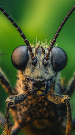 This stunning macro photograph captures the intricate details of an insects face showcasing its large eyes and unique features against a blurred green background.