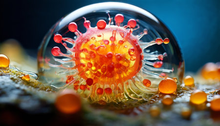 In the microscopic realm, a vibrant microbe dances, form intricate surreal. A symphony of colors shapes, it embodies unseen beauty of microbial world, a tiny marvel thriving in unseen corners of life