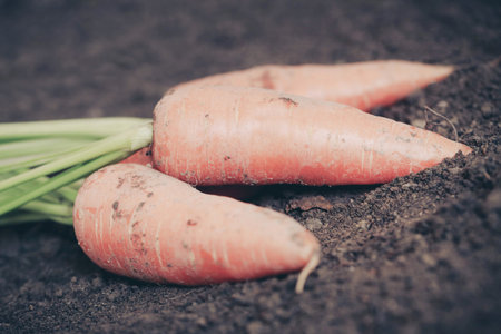 Fresh harvested ripe carrots on the ground in the garden on the planting bed.