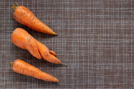 Ugly carrot concept on wooden background. Copy space. Top view
